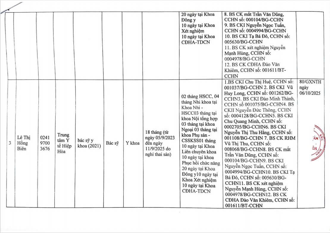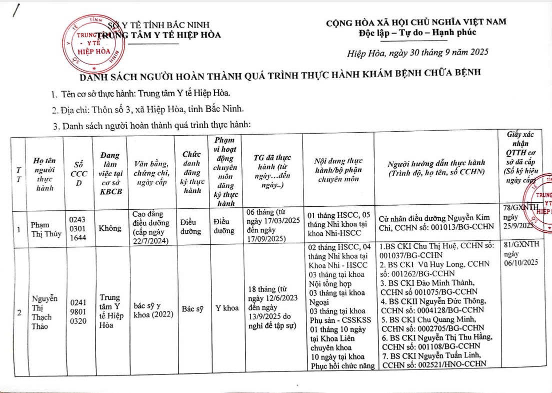 DANH SÁCH NGƯỜI ĐÃ HOÀN THÀNH QUÁ TRÌNH THỰC HÀNH KHÁM BỆNH, CHỮA BỆNH THÁNG 9 NĂM 2025