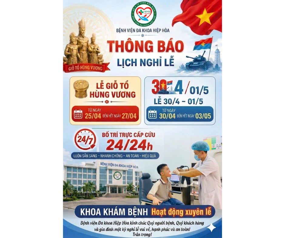 Nhằm phục vụ nhu cầu khám, chữa bệnh của người bệnh, Bệnh viện Đa khoa Hiệp Hòa trân trọng thông báo lịch nghỉ lễ Giỗ Tổ Hùng Vương, lễ 30/4 - 01/5 như sau: